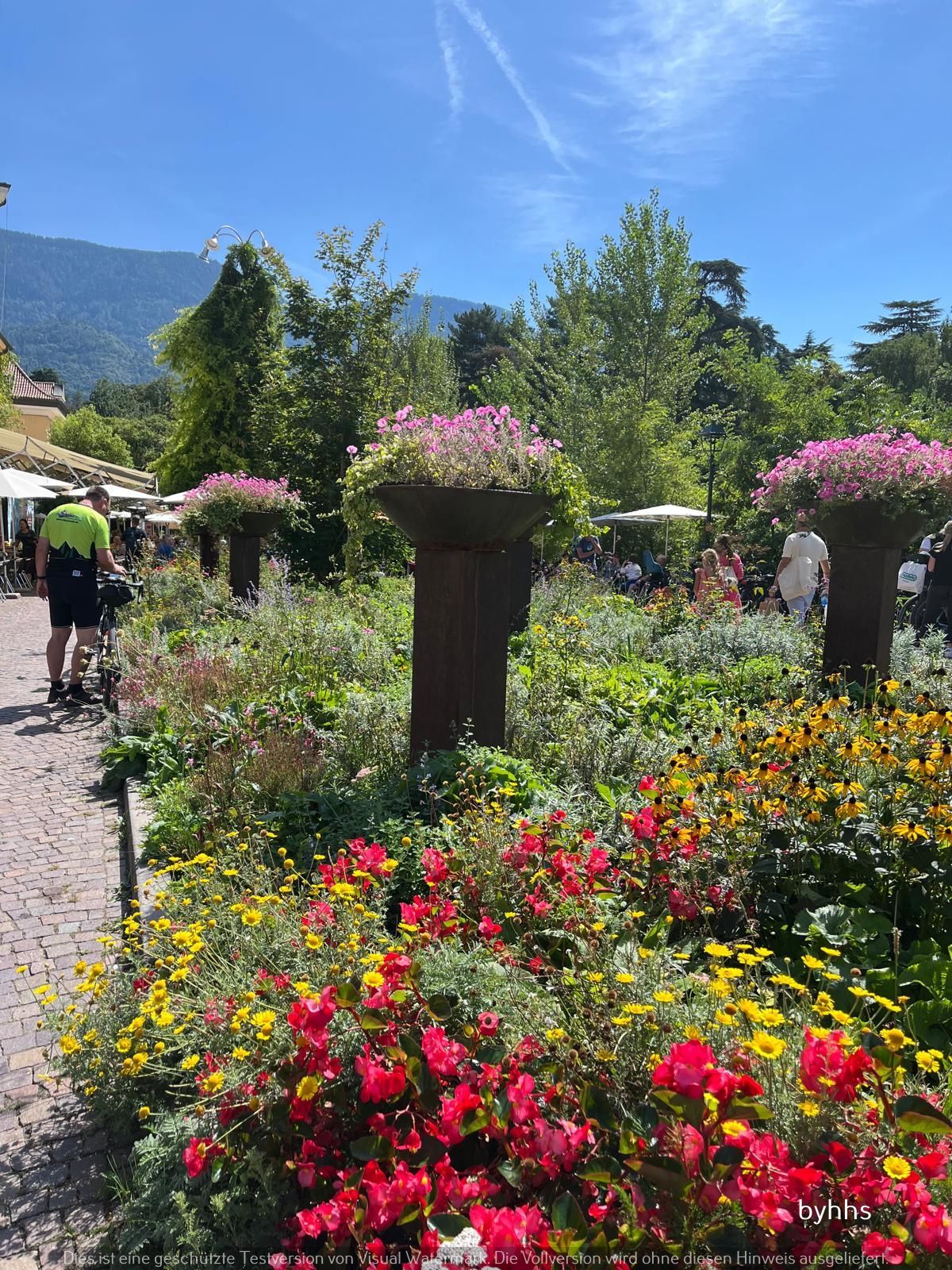 Meran: Weinstadt viel los aber entspannt, keine Hektik, schöne Kurpromenade an der Passeier entlang. Nach Bozen zweitgrößte Stadt Südtirols, rd. 42T Einwohner, halb deutsch halb italienisch. Mediterrane Pflanzen wie Palmen, Zypressen, Myrten und Zedern gedeihen hier prächtig.